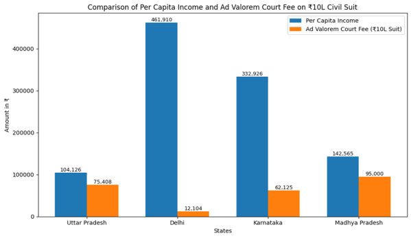India’s court-fee regime erects significant barriers to access to justice: the Law Commission has aptly described this as a “postcode lottery.” For example, a ₹10 lakh civil suit attracts a fee of only ₹12,104 in Delhi, whereas Uttar Pradesh and Madhya Pradesh apply high ad valorem fees that can drive litigation costs into several lakhs.